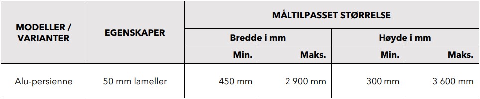 Persienner i aluminium med 50 mm lamellbredde egner seg spesielt godt til større vinduer, og gir effektiv regulering av sol og innsyn. De kan utformes for å passe inn i ethvert rom uansett stil, og de har lang levetid og tåler fukt, samtidig som de er enkle å rengjøre.