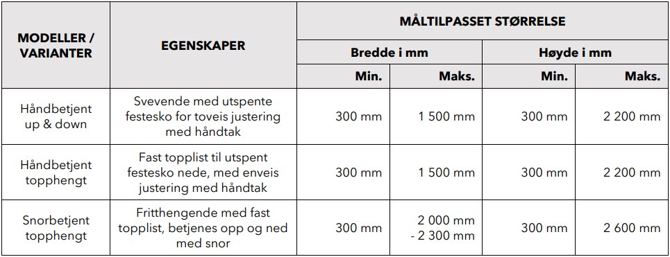 Den fritthengende plissègardinen har en fastmontert øvre list og er regulèrbar med håndtak og festesko nede. Den leveres med en topp - og bunnprofil i fire valgfrie farger. Fargen på profilene spesifiseres for å matche tekstilen eller som en kontrastfarge. Tilhørende plast-komponenter, liksom endelokk til profil, håndtak og festesko, leveres i fargen som tilhører bunnprofilen slik den er spesifisert over.