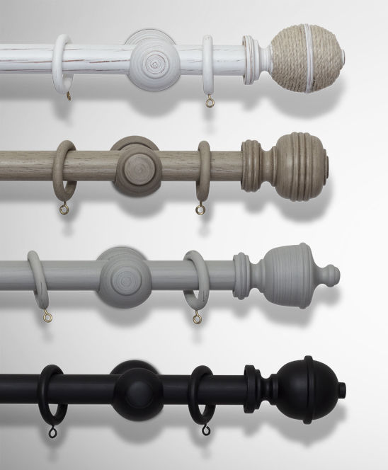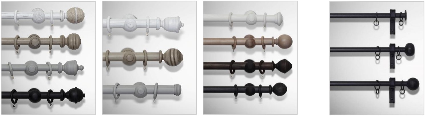 Velg blant fire vakre trefarger med beiset, stripet malt eller dekkende malt effekt. Både trestangen og annet tilbehør inklusive veggholdere, endedekor og eventuelt ringer leveres i den samme, matchende farge.