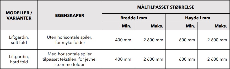 Måltilpassede liftgardiner er både tidløse og populære. Sydd uten spiler får liftgardinen myke folder, og en mer soft og shabby look. Valg av tekstil-kvalitet og forstoff avgjør om den skal være et designinnslag, eller også skjerme mot sol og innsyn.
